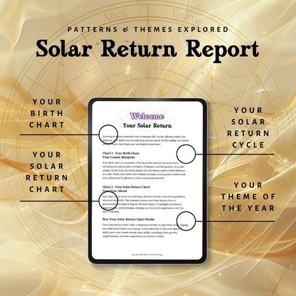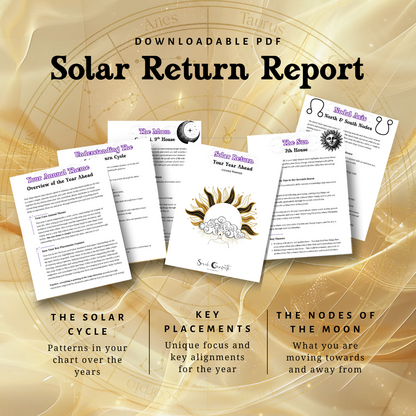 Your Solar Return Report comes to you as a professionally designed document, something you'll want to refer back to throughout the year. It includes both your birth chart and your Solar Return chart as visual references, with each theme named, labelled and explained alongside full written interpretation.